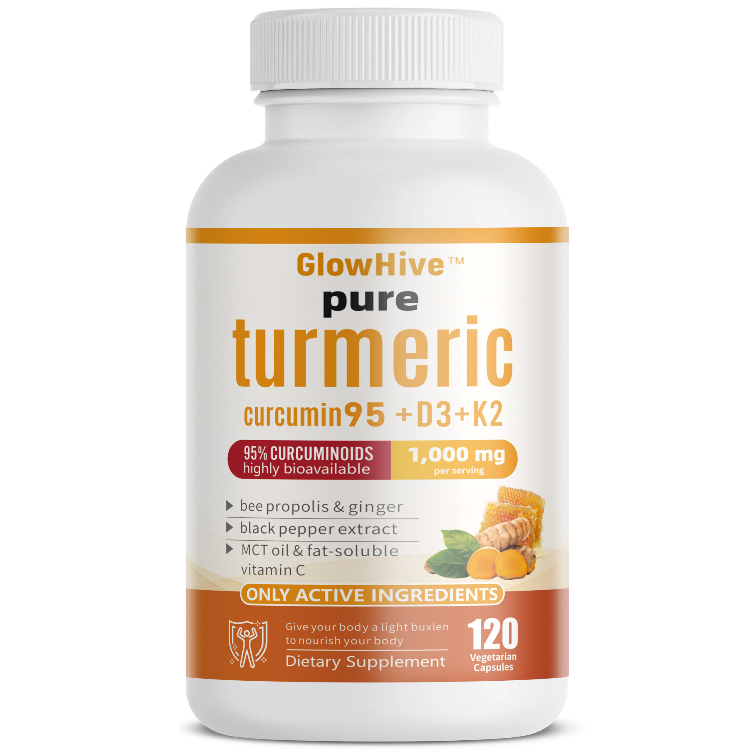 GlowHive Turmeric Curcumin 1000mg 95% Curcuminoids with Black Pepper & MCT Oil for Ultimate Absorption 120 Vegetarian Capsules Natural Organic Supplement
